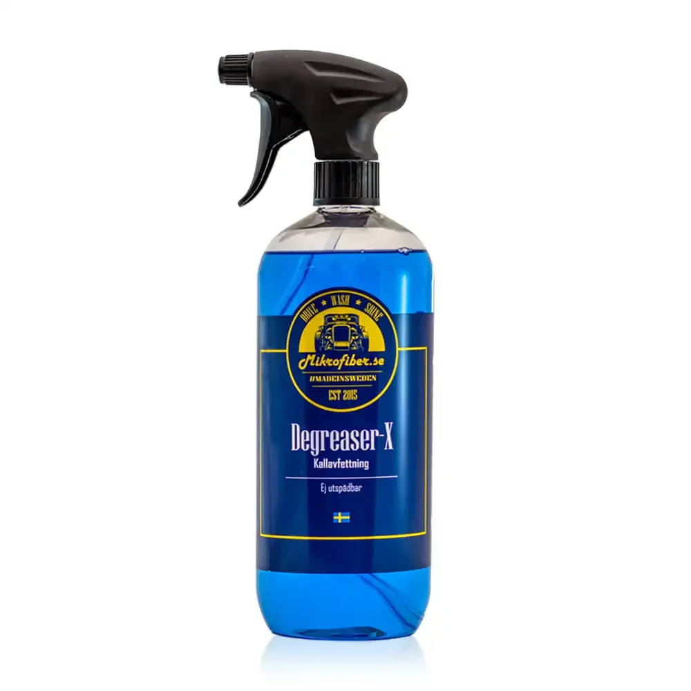 Degreaser – X är en mycket effektiv tixotropisk kallavfettning. Den löser snabbt upp olja, tjära, asfalt och annan petroleumbaserad och oljebaserad smuts. Degreaser-X är skonsam mot de flesta typer av skydd, och är därför inte lika snabb i sin verkningstid som vissa andra “starkare” kem. Du kan låta den verka mellan 5-12 min beroende på rådande förhållanden. Allt kem från Mikrofiber.se är tillverkat i Sverige. Läs mer