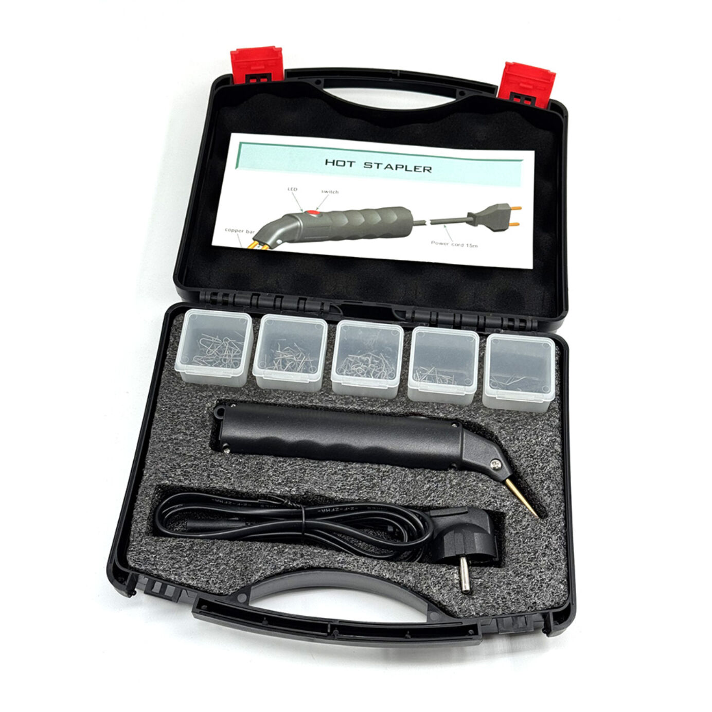 I paketet ingår 205 metallklamrar i fem olika modeller för olika typer av sprickor och vinklar, samt plastsvetsen (230V, 50W) i en praktisk förvaringsväska.Fråga 7: Passar den för nybörjare?