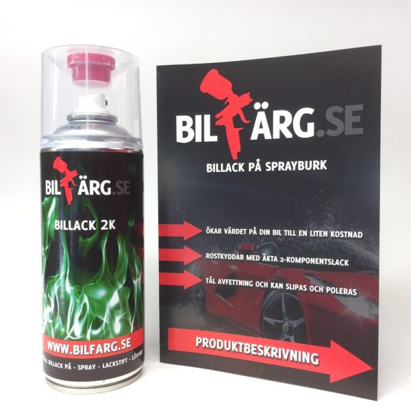 Högkvalitativ billack på sprayburk 2-komponent. Räcker för att lackera en yta på ca 1 m2. Hållbarhet på sprayburken ca 1år. Efter aktivering 3-7 timmar. Aktivera sprayburken gör du genom att ta lös den röda plastampullen som sitter i locket. Vänd sedan sprayburken upp och ner. Placera den röda plastampullen i botten av burken och tryck med ett hårt tryck tills pinnen i botten av burken rör sig.